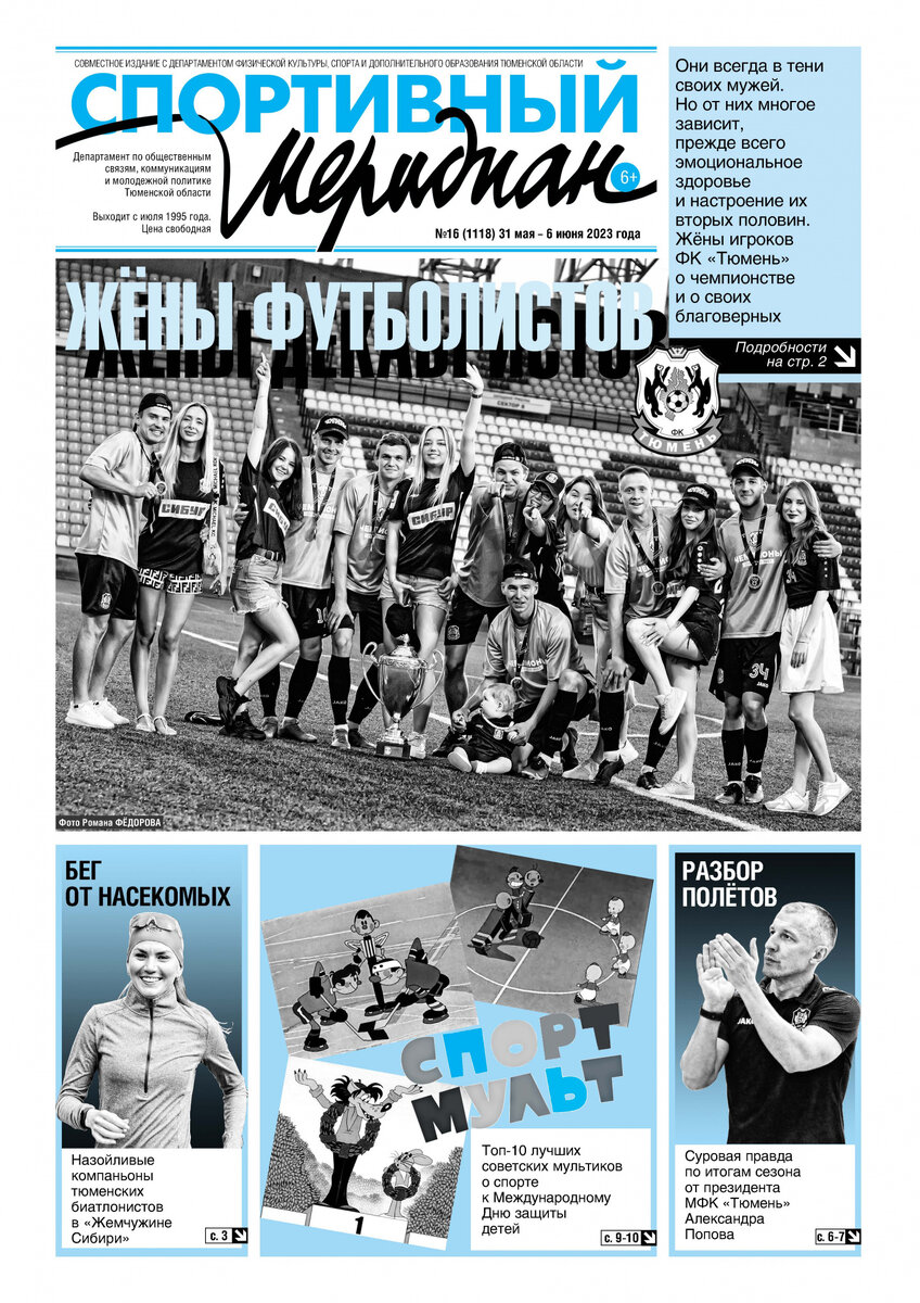 В среду вышел в свет очередной номер областного еженедельника «Спортивный меридиан». «Женский взгляд на чемпионство» — так называется материал о прорыве ФК «Тюмень» в Первую лигу. «СМ» пишет о том, как этому помогали жёны футболистов. Биатлонисты уже начали в «Жемчужине Сибири» подготовку к новому сезону. Фоторепортаж о первых тренировках стреляющих лыжников вы найдёте в свежем номере. Газета рассказывает подробности турнира «Лига бокса: На кулаках». Еженедельник публикует беседу с президентом МФК «Тюмень» Александром Поповым. В нём он подвёл итоги минувшего сезона. Под рубрикой «Увлечение» читатели узнают о том, какие игры раньше предпочитали участники тюменской Медиалиги (дисциплина «Варпойнт»). «Спортмульт-ура!» — так называется публикация, посвящённая Дню защиты детей. Также газета поместила интервью с новым главным тренером хоккейного клуба «Тюменский Легион» Алексеем Осиповым. Электронную версию «СМ» можно найти на сайте www.asnta.ru.
