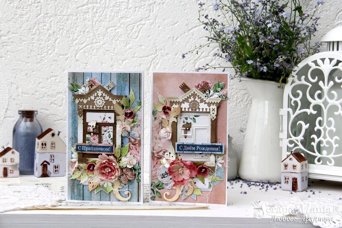 Сегодня с вами я, Любовь Архипова. Недавно я ездила по некоторым городам Золотого кольца и меня удивляли красивые резные наличники на деревянных домах. Там, куда не дошла Великая Отечественная война, осталось очень много красивых домов, украшенных резными наличниками и другими декоративными элементами. И очень радует то, что за этими домами ухаживают и поддерживают хорошее состояние. Так вот, увидев в новинках у TM ScrapMania нож "Русские сказки. Бабушкино окошко", сразу захотелось с ним что-то сделать. В дополнение к вырубным окошкам я взяла коллекцию "Пробуждение природы" TM ScrapMania. В итоге получились две прекрасные открытки с кармашками.