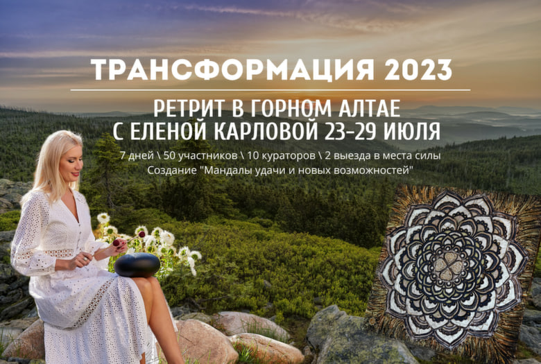 Ретрит "Трансформация 2023" Елены Карловой поможет отдохнуть и зарядиться энергией Представьте, как чувствуете полное расслабление, каждой клеточкой тела ощущаете гармонию и покой внутри, все проблемы где-то там, а здесь и сейчас только вы и ваше спокойствие. Хочется? Ещё бы, современный ритм жизни не даёт нам времени на себя. Всё время и силы забирает работа, семья и другие многочисленные обязанности. Остановить этот бесконечный бег, привести в порядок мысли, выдохнуть и отдохнуть поможет наполняющий ретрит в Горном Алтае "Трансформация 2023". Он пройдёт 23-29 июля. Это авторский ретрит Елены Карловой – художника-символиста, энерготерапевта, наставника по духовному и личностному росту, автора онлайн-школы. Вас ждут: Все время ретрита вы будете находиться в поле Елены Карловой, перенимать её мудрость и опыт создания мандал. Вы получите глубокие и, возможно, даже ранее незнакомые ощущения, силу, которую даст и сам ретрит, и энергетически могущественный Горный Алтай. Это будут идеальные