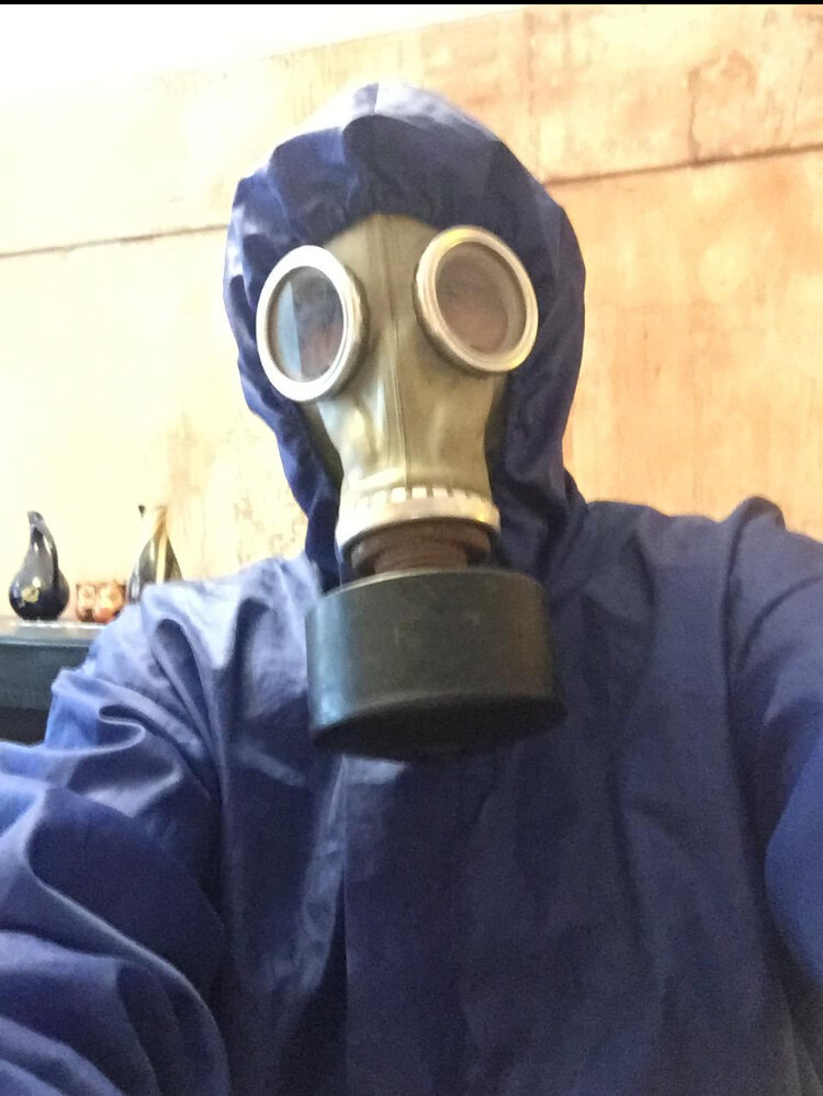 Перед работой одеваю комбинезон, перчатки, бахилы, противогаз. Начинал я с обычного респиратора и очков из оргстекла, потом перешел на панорамную маску — как в «Аватаре». Но самым удобным и эффективным оказался обычный армейский противогаз, уже много лет работаю с ним. Одного хватает примерно на год, фильтры меняю чаще.