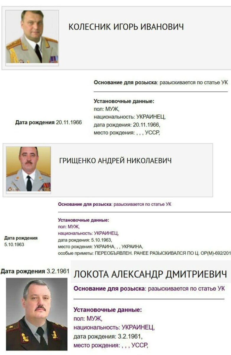 Им предъявлены обвинения в гибели более 500 мирных жителей Донбасса. МВД России объявило в розыск трех украинских генералов, в их числе и первый замначальника Генштаба ВСУ Игорь Колесник, обвиняемые в гибели более 500 мирных жителей Донбасса, как следуеб из базы МВД они объявлены в розыск. «Основание для розыска: разыскивается по статье УК», – указано в карточке. Также в базе значатся заместитель начальника Генштаба ВСУ Александр Локоте и заместитель командующего Сухопутными войсками Украины Андрей Грищенко. Их розыск также ведется по уголовной статье. Ранее Readovka писала о том, что МВД России объявило в розыск главкома ВСУ Залужного.