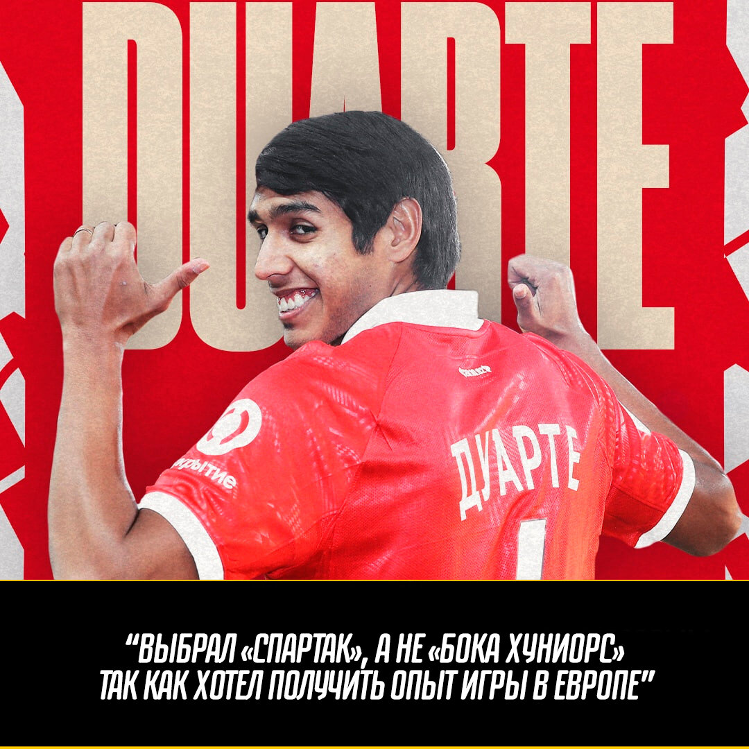 💬 Мне хотелось получить опыт игры в Европе. Долго размышлял, советовался с семьей. В итоге решил попробовать и выбрал «Спартак», — сказал Дуарте. Если честно, мне как-то не пришло в голову посоветоваться с Мельгарехо или Барриосом, которые так же выступали за «Спартак»! Так что с этими ребятами не общался. Но я знал, что «Спартак» — большой клуб и самая популярная команда в России. Так что не скажу, что принимал решение вслепую.