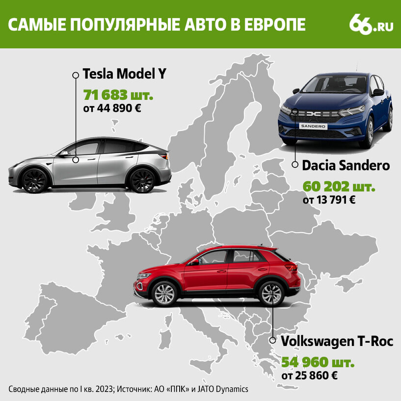 Локально нам ближе европейская часть континента, и там картинка схожая со всем миром. Недешевая (от 44 890 €) Model Y по итогам первого квартала обогнала и самый дешевый автомобиль в принципе (Sandero, от 13 791 €) и тоже не бюджетный VW T-Roc (от 25 860 €). На российском рынке все чуть хуже и с тиражами, и с наполнением. Солирует вазовская Granta, которая при начальной стоимости в скромные 8000 € разошлась за квартал тиражом в 1,5 раза меньшим, чем Model Y у соседей в Европе. Следующий бестселлер Lada — Niva Travel — за квартал нашел в 4 раза меньше владельцев, чем Granta, и в 5 раз меньше владельцев, чем T-Roc у соседей. Замыкает российский топ-3 единственная иномарка в списке — компактный кроссовер Jolion от китайской Haval. По размерам, смыслам и стоимости он близок к T-Roc, только вот продается у нас Jolion в 8 раз хуже, чем T-Roc у них. В целом по первому кварталу на российском рынке продано 171 292 новые легковушки (-35% к 2022-му), в Старом Свете только за последний месяц — 960