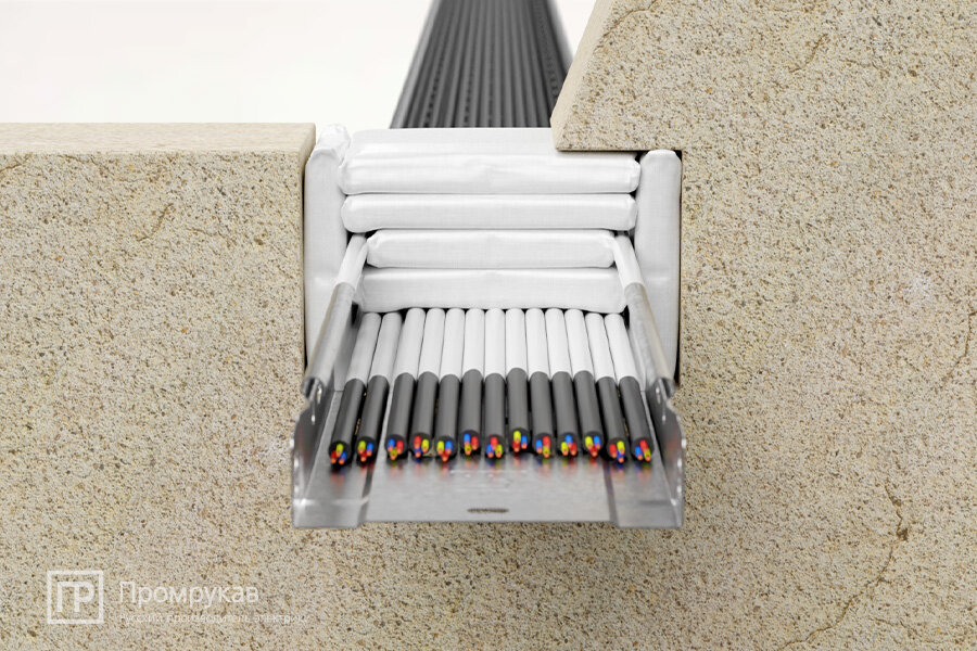 Компания Промрукав предлагает комплексное сертифицированное решение – универсальные кабельные проходки, предназначенные для заделки мест прохода кабелей через ограждающие конструкции с нормируемыми пределами огнестойкости или противопожарные преграды и препятствующая распространению горения в примыкающие помещения в течение нормированного времени. Кабельная проходка включает в себя кабели, закладные детали (лотки), заделочные материалы (огнестойкие подушки) и сборные или конструктивные элементы.