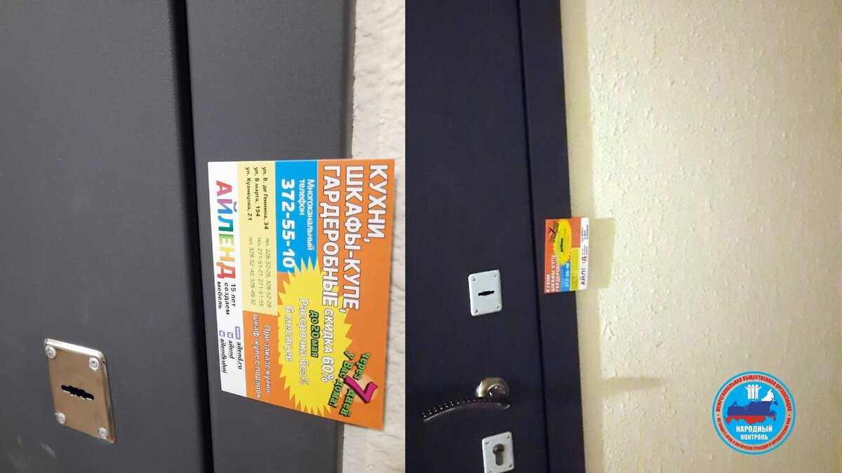Поступило обращение из Екатеринбурга о расклейке рекламных объявлений на дверях квартир и поверхностях в жилом доме (общедомовое имущество).