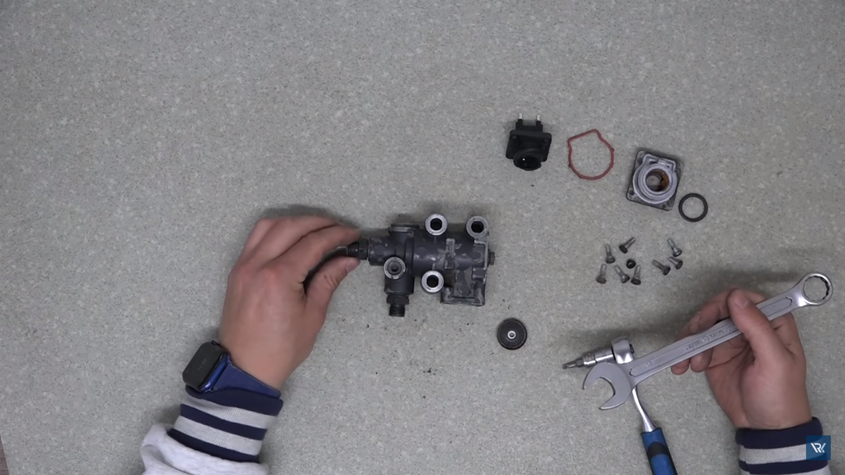 Привет, друзья! Мы с вами продолжаем разбирать следящий клапан – важное устройство горного тормоза, из-за которого в последнем могут быть неполадки. Ранее мы обнаружили и назвали важнейшее, хоть и банальное по своей сути зло для клапана – ржавчину внутри корпуса. Начало здесь: Сегодня доразберем следящий клапан в своей лаборатории и расскажем, а также покажем наглядно, что ещё может стать причиной неисправности. Кстати, разбирать какой-либо узел Скании на молекулы – отдельное удовольствие, в чем и предлагаем убедиться. Берем ключ на семнадцать и откручиваем по часовой две трубки. Откручиваем – громко сказано, они не поддаются. Относим на тиски – только так и получилось. Снимаем два штуцера и специальные резиново-металлические уплотнения. Попробуем выбить основной элемент. Ножичком пробуем подцепить уплотнение, такое ощущение, что оно и не резиновое. Ещё одно уплотнение прилипло. Сняли – смотрим внутрь: там есть специальное ситечко (смотрите на видео), чтобы при подаче воздуха лишнего