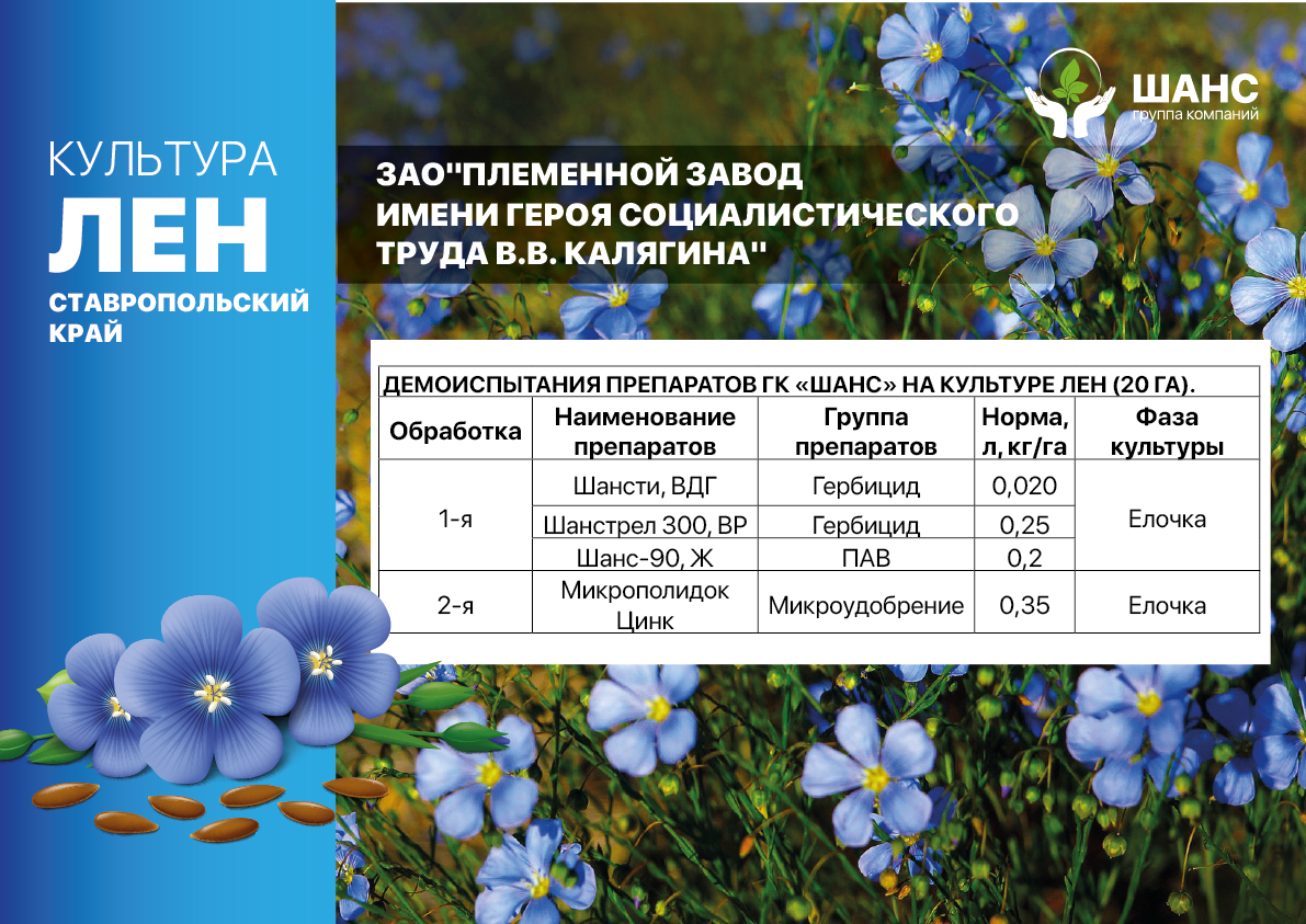 Дорогие друзья, хотим поделиться с вами результатами демоиспытаний, которые мы провели на полях ЗАО "Племзавод им. героя соц. труда В.В. Калягина" в поселке Красочный (Ставропольский край). Это огромное хозяйство, занимающее общую площадь 23 800 гектаров! 😍 Мы активно работали на поле площадью 90 гектаров, где выращивали лён. Предшественником на этом поле была озимая пшеница. Исследования проводил опытный агроном-консультант ГК "Шанс" - Л.В. Телюкин, который поделился с нами своими наблюдениями и результатами исследований. Первую обработку провели в фазу "елочки", используя препарат Шанстрел 300, ВР в дозировке 0,25 литра на гектар, а также Шансти, ВДГ в дозировке 20 граммов на гектар. Чтобы улучшить адгезию препарата добавили ПАВ Шанс-90, Ж к составу обработки. Во второй обработке мы применили микроудобрение Микрополидок Цинк в дозировке 0,35 литра на гектар. Это позволило восполнить дефицит цинка, серы и магния и обеспечить лучший рост и развитие растений. Сошников Д.В., главный аг