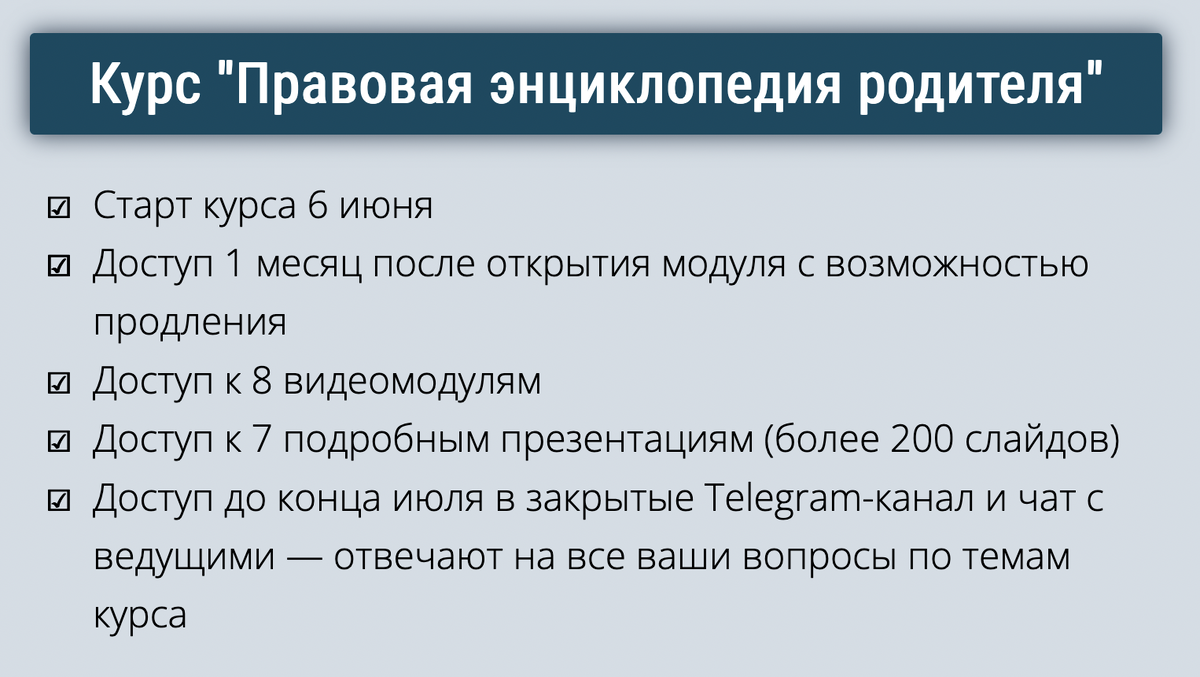 Именно для этого мы и сняли наш новый правовой курс специально для родителей. За три недели вместе погрузимся в подростковый мир, чтобы получить в том числе конкретные алгоритмы действий: проблема, потенциальная опасность, возможные юридические последствия, как можно не допустить, иногда просто сыграв на опережение.