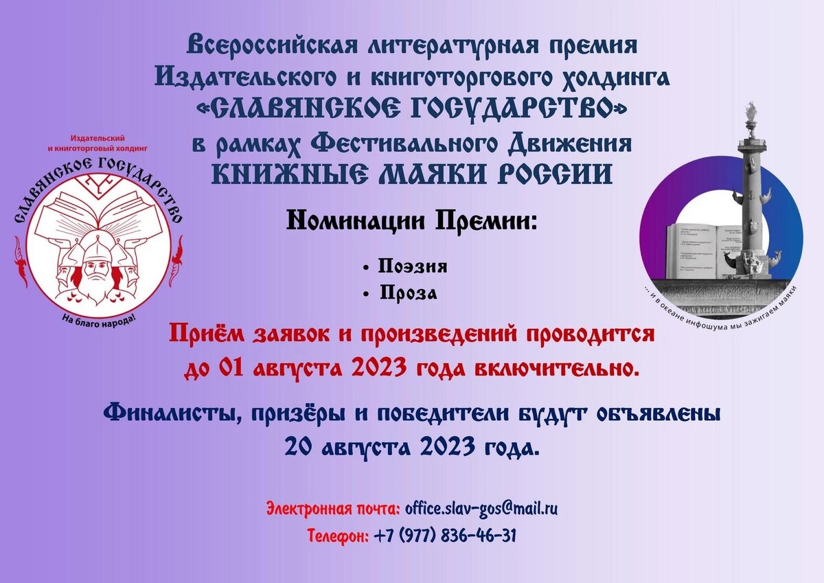 Сайт slav-gos.ru Всероссийская литературная премия Издательского и книготоргового холдинга «СЛАВЯНСКОЕ ГОСУДАРСТВО» в рамках Фестивального Движения КНИЖНЫЕ МАЯКИ РОССИИ Положение о Премии Литературная премия Издательского и книготоргового холдинга «СЛАВЯНСКОЕ ГОСУДАРСТВО» (далее — Премия) учреждена Издательским и книготорговым холдингом «СЛАВЯНСКОЕ ГОСУДАРСТВО» в 2023 году в рамках Фестивального Движения КНИЖНЫЕ МАЯКИ РОССИИ, при поддержке Союза деятелей культуры и искусства и литературно-художественного журнала «Новая Литература России». Номинации Премии: • Поэзия • Проза Автор не имеет права на предоставление материалов сразу в нескольких номинациях. Награды: • Номинанты, финалисты и призёры награждаются Специальными Именными Дипломами. • Победитель (в каждой номинации) награждается Специальным Именным Дипломом, а также сертификатом на бесплатную публикацию в литературно-художественном журнале «Новая Литература России» (формат А4, 1 стр.). Соискателями Пр