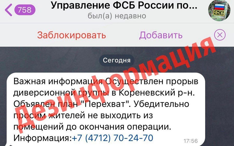Сегодня жители Курской области стали получать сообщения в соцсетях и мессенджерах якобы от имени ФСБ о прорыве диверсионной группы ВСУ в одном из приграничных районов и введении операции «Перехват». В администрации региона вечером 31 мая опровергли данную информацию. Это фейк. «Новая дезинформация от ЦИПсО: в этот раз они пишут курянам от лица ФСБ. Не поддаемся панике, но сохраняем бдительность!» — говорится в официальном сообщении Дома Советов. О подозрительных гражданах, оставленных предметах и беспилотных летательных аппаратах сообщать по номеру 112. Друг для друга Курск Онлайн, фото тг-канал Курская область Постоянный адрес новости на сайте «Друг для друга» ~ https://dddkursk.ru/lenta/2023/05/31/098277/. Новости Курска за ~ 31 мая ~ май 2023 года.
