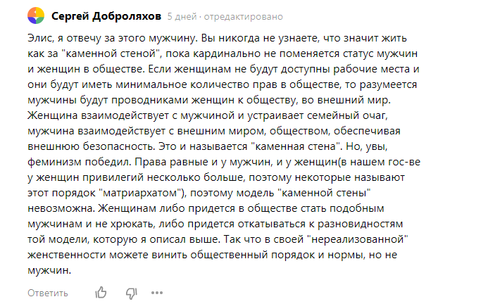 Другими словами, данный комментатор просто хочет быть властелином в отношениях/семье и чтобы женщина не смела даже рот открыть, если ей что-то не нравится. Прям страшненько становится, когда понимаешь, что такие мужчины могут быть где-то рядом и ты просто не знаешь, о чем он там себе думает. Хочет-то он одного, а тебе красиво заливает про реализацию женственности в такой модели общества. Какая там женственность, если ты рабыня при господине?