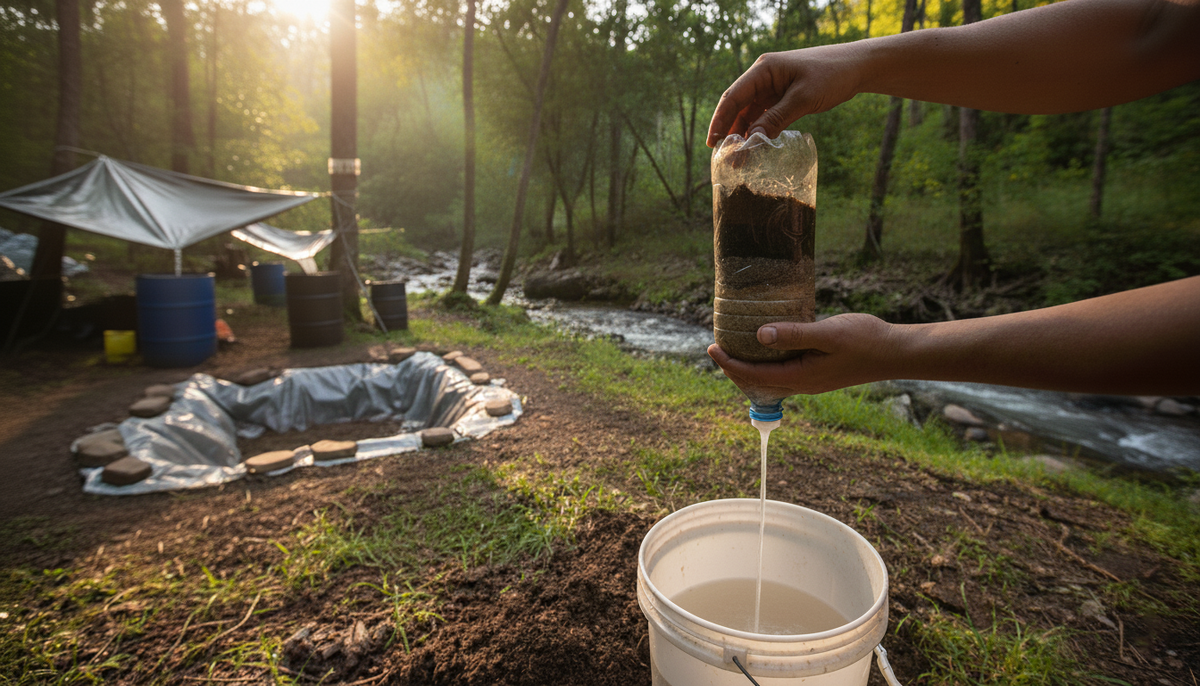 2.3. Сбор воды из природных источников. Сами источники воды чаще бывают расположены в низинах, их можно найти, ориентируясь по влажности и насекомым. Вода чище в подвижных источниках, вдали от людей, у основания ручьёв. Перед сбором воды следует осмотреть водоём на наличие трупов животных, например труп крупного животного выше по течению значительно повышает содержание в воде опасных микроорганизмов. Перед сбором воды следует её понюхать, резкие запахи укажут на сильное загрязнение. Собирать воду следует не с поверхности и не со дна водоёма, а в промежутке между ними. Вода, собранная из природных источников в большинстве случаев, требует очистки.