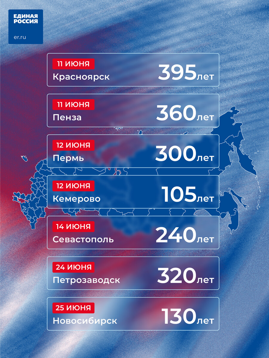 🇷🇺В июне свои юбилеи отмечает целый ряд крупных российских городов. В каждом из них определенно есть что посмотреть. Посетить заповедник «Столбы» под Красноярском, пройтись по «парку камней» в Перми, а в Севастополе увидеть древний «Херсонес», где более тысячи лет назад принял таинство крещения князь Владимир.