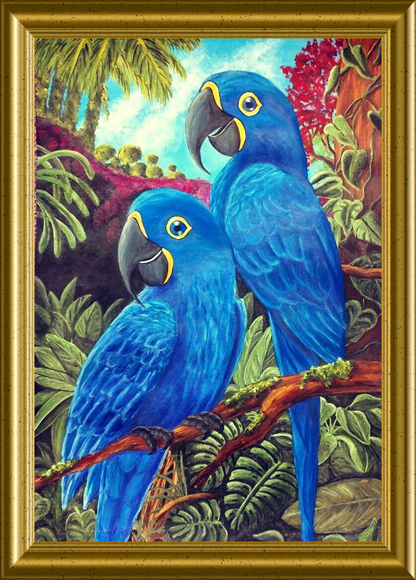Один раз я искала в Интернете какие-нибудь красивые картинки, чтобы что-то нарисовать. Я наткнулась на этих попугаев и тут же решила их рисовать. Я старалась нарисовать все растения позади птиц. Получилось так, что это стало последней моей картиной гуашью в 2022 году. Потом я уже создала акрилом на холсте замок Нойшванштайн. Гуашь, акварельная бумага. Август 2022 года. #гуашь #акрил #картина #рисунок #картинамаслом #рисованиегуашью