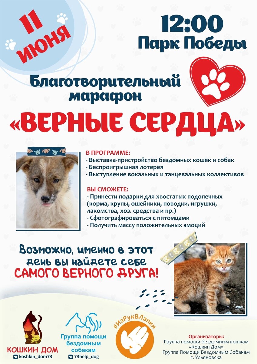 Совсем скоро, 11 июня в парке Победы состоится благотворительный марафон "Верные сердца" ♥️ Наши подопечные очень нуждаются в Вашей помощи 🙏 На марафоне можно не только выбрать себе любимца, но и помочь самым необходимым для содержания подопечных групп. Что можно принести? ✍️ Корм для кошек и собак (влажный или сухой); ✍️ Любые крупы для каш (кроме гороха, перловки и пшена); ✍️ Любые консервы ✍️ Одноразовые пеленки ✍️ Средства для уборки и стирки (стиральный порошок, доместос и подобные, лайна, ср-ва для мытья посуды) ✍️ Лотки, мисочки ✍️ Тканевые пеленки, ветошь (старое постельное белье, полотенца и т д, чистые) ✍️ Аммуниция для собак (проводки, ошейнкики) ✍️ Средства от блох, клещей и гельминтов Список самого необходимого: https://vk.com/topic-32843644_48161966 Так же можно передать любую помощь заказав на Ozon, WB, Kazanexspress в пункты выдачи по адресам: Wildberries - пункт выдачи г. Ульяновск ул. Кирова 12б Ozon - пункт выдачи г. Ульяновск ул. Пушкинская 4а Kazanexspress
