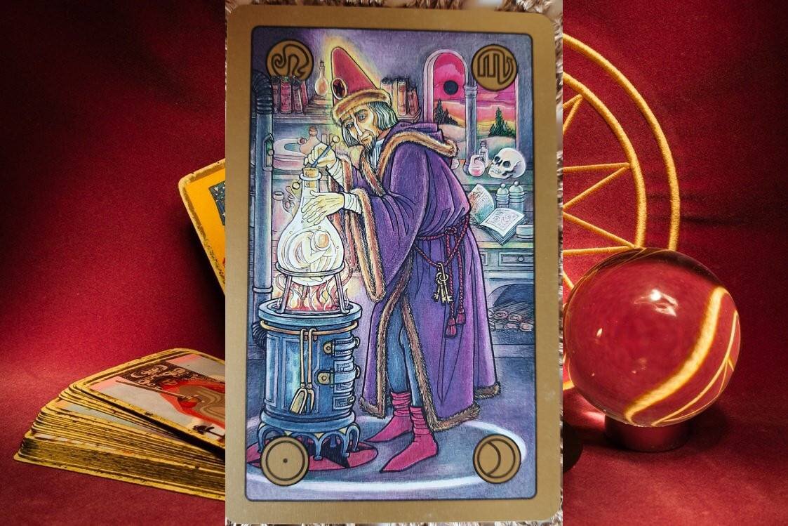 Алхимик. Карта обычно символизирует процесс превращения, трансформации и алхимического слияния. Эта карта обычно означает, что происходит некий важный переход или изменение в отношениях между людьми.