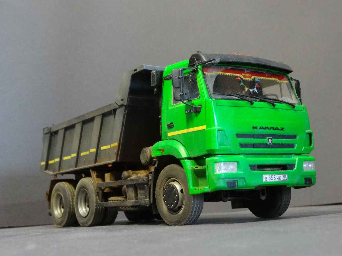 Приветствую! КамАЗ 65115 от Звезды в 35-м масштабе. Внезапно долгострой, впервые ворчал на большое количество деталей и подробную ходовую. С одной стороны вроде и деталировка, с другой стороны и не видно её все равно(особенно двигатель, который ща кабиной прикрывается кожухом). Хотя, шучу, действительно классный набор. С цветом тоже не все так просто. В жизни надоели рыжие КамАЗы, тут увидел на дороге китайский самосвал в таком окрасе и подумал: " Китайцы свои самосвалы так красят, а что КамАЗ хуже?!". Краска Mr.Color (флюорисцентный зелёный( весьма капризная штука в нанесении. Наносить тонкий слой- весь прешейд видно контрастно, да и цвет не яркий, наносишь слой толще, все равно четкие границы, ещё слой и, хоба, потёки и местами апельсиновая корка. Потом шлифовка, лак, шлифовка, потом плюнул и оставил так. Колеса от Миниарм(покрышки), то ещё развлекалово. Вот когда у них полностью колеса-все супер, а вот когда они сделали только покрышки, то стыковочка стала сомнительной, да и модель