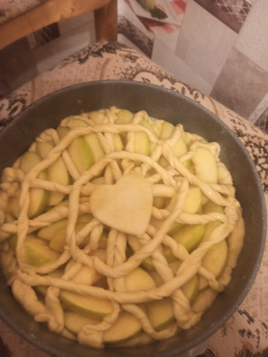 Всем привет! Дополню дневную пиццу открытым пирогом с яблоками. Тесто дрожжевое, как раз осталось от пиццы, а в холодильнике валялись яблоки. Тесто раскатать по форме, выложить на пергаментную бумагу, посыпать сахаром немного, сверху уложить яблоки, порезанные дольками, можно посыпать корицей, я не люблю. Из теста делаем полоски-спиральки и укрываем ими яблоки. Шов, где пересекаются полоски можно укрыть сердечком Смазать все яйцом и убрать в разогретую духовку 180 гр, на 20 минут и можно пить чай. С яблок не снимайте кожуру и выбирайте твердые сорта, у нас голден, иначе будет каша