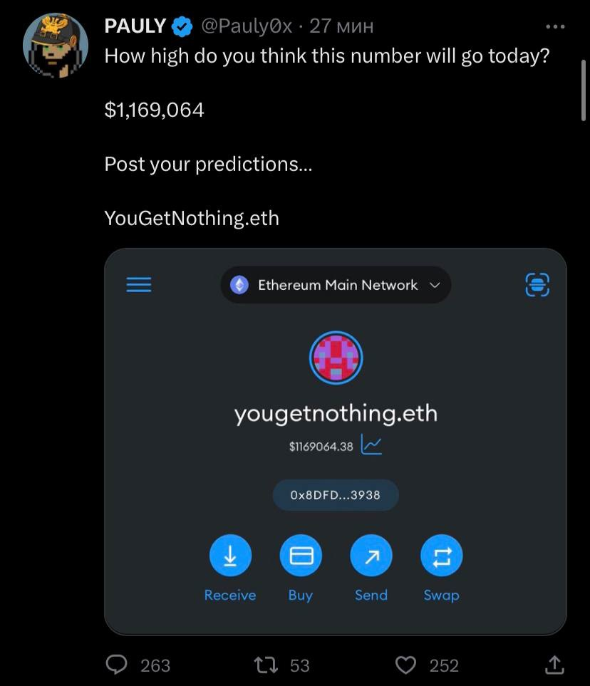 Вчера один пользователь твиттера с 70 тысячами подписчиков выложил сообщение со своим адресом ETH и кратким посланием: "Отправляйте ETH и не ждите взамен ничего". Несмотря на это, собрано более 1.1 миллиона долларов.