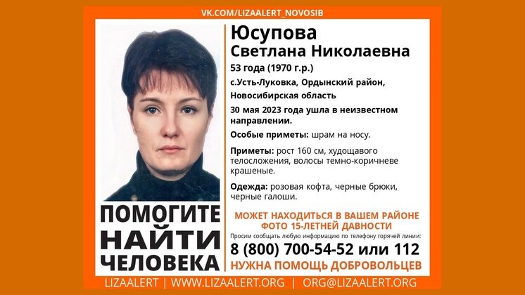 В селе Усть-Луковка Ордынского района без вести пропала 53-летняя Светлана Юсупова. Как рассказали волонтеры поисково-спасательного отряда (ПСО) «ЛизаАлерт Новосибирской области» в социальной сети «ВКонтакте», 30 мая 2023 года женщина ушла в неизвестном направлении. «Заявка поступила на горячую линию отряда о пропаже женщины – вышла из дома в сторону леса и пропала. Начат информационный поиск, идет активное распространение ориентировки в сети. В ночь на 1 июня был объявлен сбор на поиск добровольцев. В штабе был зарегистрирован 21 человек», – сообщили в пресс-службе отряда. Приметы пропавшей: рост 160 сантиметров, худощавое телосложение, волосы темно коричневые, крашеные. В день исчезновения была одета в розовую кофту, черные брюки и галоши. Из особых примет – у сибирячки есть шрам на носу. Для ориентировки было использовано фото 15-летней давности. Если у вас есть информация о местонахождении Светланы Юсуповой, сообщите об этом по телефону ПСО 8-800-700-54-52 или наберите 112. Ранее «