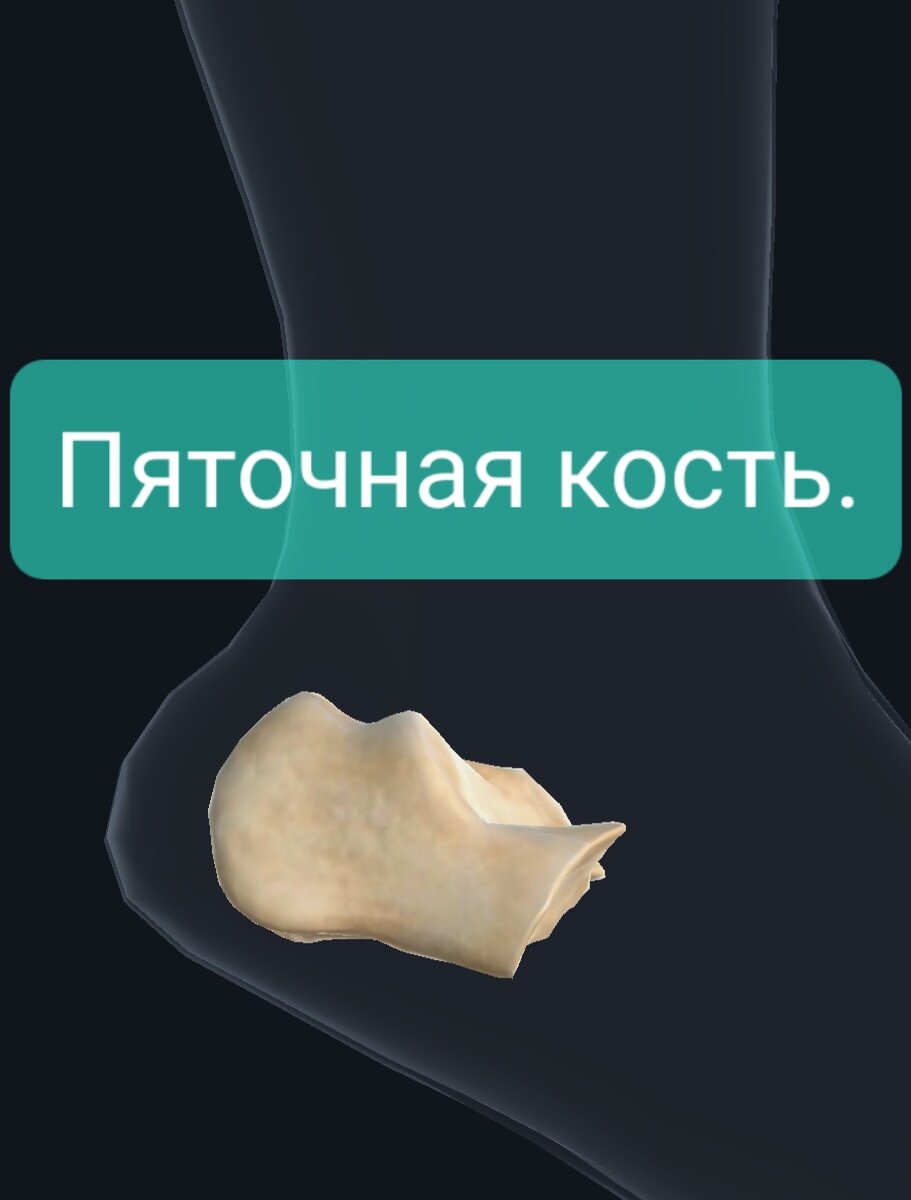 Располагается в задней части предплюсны, очень важная в плане опоры, узнаваемая по названию, но не по форме. По строению пяточная кость - короткая губчатая. Сложной формы, ассиметричная. В строении отдельно выделяют пяточный бугор (костный ориентир), к которому крепится ахиллово сухожилие сзади, подошвенная фасция и короткий соибатель пальцев снизу (тут все сразу вспомнили про "пяточную шпору", да она как раз тут, но она не то, за что себя выдаёт). На латеральной стороне есть малоберцовый блок (небольшой отросток, через который сухожилия малоберцовых мышц меняют своё направление), а позади него борозда сухожилия длинной малоберцовой мышцы). На пяточной кости располанаются четыре суставных поверхности: От пяточной кости начинается большаячасть мышц стопы - это короткие разгибатели пальцев, короткип сгибатели пальцев, мышцы, отводящие большой палец и мизинец стопы, квадратная мышца подошвы. Пяточная кость часто даёт о себе знать. Вокруг неё бывают воспаления (подошвенный фасциит,