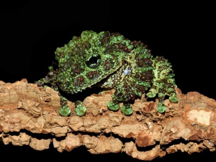Лягушка Theloderma corticale – один из наиболее превосходных мастеров маскировки среди земноводных (Amphibia). В мире бесхвостых амфибий (Anura) ей мало кто может поспорить в этом деле. Животным часто нужна маскирующая окраска и внешность, чтобы обезопасить себя от хищников или стать успешным охотником. Некоторые виды, такие как осьминоги, хамелеоны и насекомые, известны своей способностью исчезать в окружающей среде, а лягушки также показывают схожие таланты в искусстве маскировки. Лягушка Theloderma corticale обитает в тропиках и имеет камуфляжную зеленую окраску, а ее тело покрыто наростами разной формы, делая ее очень похожей на кусочек мха на камнях или коре деревьев. Поэтому эту лягушку часто называют "мшистой". Целиком название ее видовой принадлежности звучит как вьетнамская мшистая лягушка, и она обитает только во Вьетнаме. Бородавчатая веслоногая лягушка, известная как Theloderma corticale, относится к семейству Rhacophoridae. Эти лягушки получили свое название благодаря бол