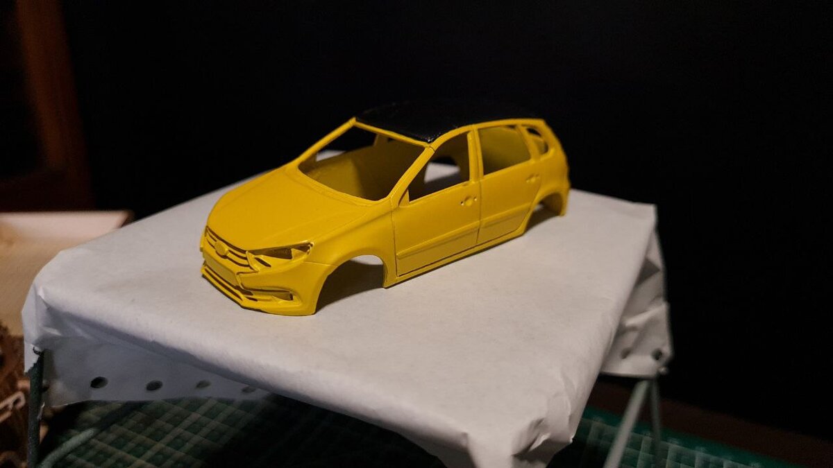 Совсем недавно я начала работу над моделью гоночной Калины. Вроде бы это Калина, но мордочка у нее от рестайлинговой Гранты. Это будет гоночный, раллийный автомобиль, поэтому хочется сделать её несколько по-другому. У меня в арсенале есть несколько баллончиков красок от Звезды. Это нитро-акрил и по идее он должен поддаваться полировки. Вначале я загрунтовала Ладу, верней только кузов. Кстати грунт от Звезды это лучший продукт в их линейке аэрозольных красок. Он отлично "прилипает" к пластику, металлу и смоле. После грунта я покрыла модель жёлтой краской от все той же Звезды. Результат Вы можете видеть на фото. В целом даже без каких-либо манипуляций с основным слоем результат получился очень даже адекватным. Но ради интереса я решила попробовать пополировать краску (хотя в теории нужно полировать лак). Краска сама по себе отлично поддается полировке. Я проделала этот процесс при помощи гелей для полировки от Тамии и кусочка ремня. Но потом случился казус. Мне нужно было окрасит