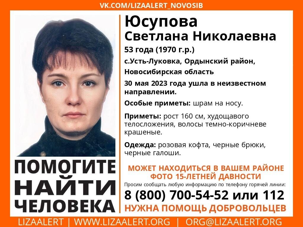 В Ордынском районе Новосибирской области начали поиски пропавшей женщины. Жительница села Усть-Луковка в Ордынском районе Новосибирской области Светлана Юсупова пропала 30 мая. Об этом сообщили волонтёры поискового отряда Лиза Алерт. 53-летняя Светлана Юсупова ушла в неизвестном направлении. На момент публикации её местонахождение неизвестно уже 2 дня. Из особых пример пропавшей женщины — шрам на носу (представленное фото — 15-летней давности). Светлана Юсупова ростом 160 см, имеет худощавое телосложение, волосы тёмно-коричневые, крашеные. Пропавшую женщину в последний раз видели в розовой кофте, черных брюках и черных галошах. Поиски, объявленные спустя несколько часов или дней после пропажи человека, имеют максимальные шансы оперативно найти пропавшего живым и здоровым. Так, ранее Сиб.фм сообщал, что в Новосибирске прекратили поиски 22-летнего парня в бордовых штанах. Его нашли живым спустя трое суток после исчезновения.