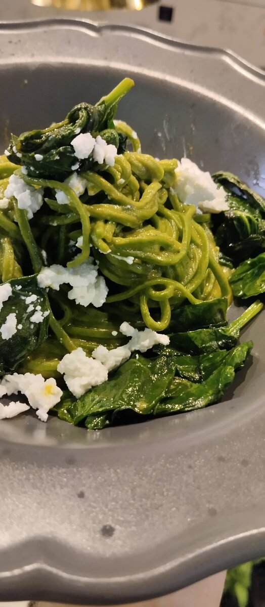Легкая, сытная и освежающая - все это сочетается в данной пасте. Она проста в приготовлении и не требует от вас большой сноровки и профессионального оборудования. На 4 порции Для теста: Шпинат бланшированный и отжатый 110г Яичный желток 125г Мука сорта экстра 225+50г Для соуса Цукини 200г Стебель сельдерея 70г Масло растительное 30г Шпинат отжатый 100г Вода из под шпината 100г Уксус винный белый 10г Чеснок 4шт Для отдачи 50г лимонного сока Сыр козий 150г Шпинат свежий 100г Пармезан 40г Оливковое масло 30г Соль, перец Делаем тесто Шпинат берите замороженный, как для теста так и для соуса. Шпинат нужно разморозить и максимально выдавить из него жидкость, ввести желток и хорошо его замешать. В получиушуюся массу партиями вводим просеяную муку. Получиашееся тесто заворачиваем в пищевую пленку и оставляем на один час. Пока тесто отдыхает, сделаем соус. На растительном масле обжариваем стебель сельдерея и цукини. Шпинат замороженный нужно разморозить, а жидкость от него сохранить