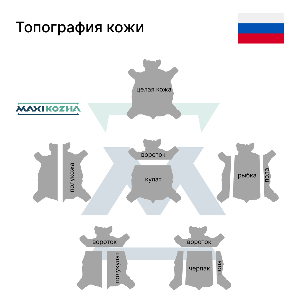 Рассмотрим 2 вида чепракования: европейское и российское. Начнем с того, что чепракование — это разделение шкуры, голья или кожи на основные топографические участки (участка шкуры на теле животного): чепрак, вороток и полы, хаз и передину, рыбку и полы, кулат и вороток и т.д.. Чепракованию подвергают яловку, бычину, бугая, крупные конские, свиные, верблюжьи и шкуры крупного рогатого скота, топографические участки которых сильно различаются по толщине, плотности, микроструктуре и назначению. Давайте попробуем разобраться, на какие участки делится шкура и как их использовать. Деление кож по Российским стандартам Целиковую кожу животного называют «целая кожа», коротко ЦК. В такой конфигурации чаще всего выпускают мебельную, автомобильную и одёжную кожи. Именно для этих изделий важно сохранение максимально большой площади для будущих изделий. Соответственно ее назначению коже задают определенные свойства по время изготовления на заводе. Когда ЦК делят на 2 части, разрезая ее по лин