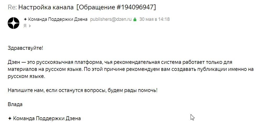 Меня вот тут недавно заинтересовал вопрос следующего плана: "А можно ли вести канал Дзен на английском языке?" Не то чтоб я знала английский или планировала освещать англоязычный быт или новости, но просто стало интересно. Этот вопрос меня изводил несколько дней, я прошарила правила Дзена, все поисковые системы и в конце концом решила задать вопрос поддержке Дзена.