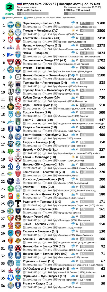 Ещё 7 матчей собрали более тысячи зрителей: в Тюмени (2500), Костроме (2418), Омске (2378), Песчанокопском (1824), Иваново (1702), Муроме (1200) и Барнауле (1100). При этом для «Тюмени» это повторение рекорда домашней посещаемости в текущем сезоне.