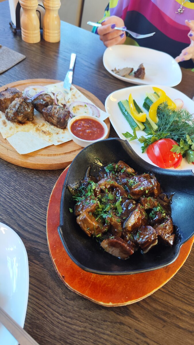 Из новых для меня блюд, мы заказали верблюжатину и ягненка, тушеного в собственном желудочке. Так вот, хочу я вам сказать, что верблюжатина-это топ. Я могу спокойно сказать, что буду теперь пробовать ее в разных вариациях, но по началу я очень боялась, что их мясо будет похоже на баранину, а баранину я просто не выношу. Даже та из нас, которая впринципе не очень любит любое мясо, кроме куриного, ела его с удовольствием))