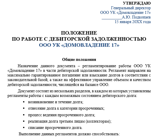 Регламент по работе с дебиторской задолженностью — распространенный документ, позволяющий эффективно контролировать и управлять ДЗ. Особенно этот документ требуется там, где необходимо установить единый порядок работы с ДЗ по нескольким подразделениям (например, в группе компаний или в сети филиалов). Также регламент нужен, если у предприятия в силу характера его деятельности имеется большое количество мелких дебиторов, долги которых нужно отслеживать и оперативно ими управлять.