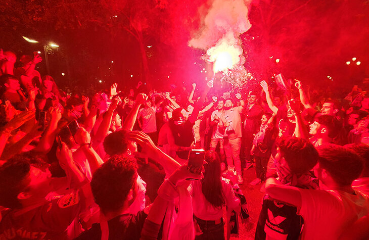Репортаж Андрея Васильева – из города победителей. Ну неужели седьмую победу можно отмечать так, как будто не было ни одной раньше? Можно! Эмоции тут только умножаются. Растут в прогрессии. А воздух наполняется разными оттенками красного. Все в Севилье знают заранее, где праздновать большие победы. Точка кипения – Пуэрта Херес. Это небольшая и неклассическая площадь в конце центральной пешеходной улицы, рядом одна из самых востребованных станций метро (ветка единственная, и она больше для связи с пригородами), тут же фонтан. Он не работает и огорожен – предусмотрительно. Уже через полчаса после пенальти Гонсало Монтьеля тут несколько сотен фанатов, не поехавших в Будапешт. Они разогреваются чуть вдалеке. Через час – точно больше тысячи или даже двух. В толпе горячо. Где именно вспыхнет следующий файер, всегда сюрприз. Может и прямо под носом. Это отличный способ перетянуть внимание толпы: где возникает огонь, туда автоматически переезжает центр празднования, все оборачиваются моменталь