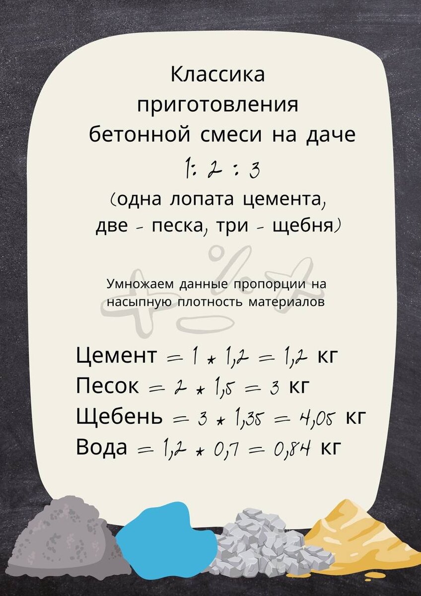 Мы все привыкли, что бетонную смесь изготавливают на заводе, где с дозированием проблем нет. Но, к примеру, если надо что-то залить даче, часто мы лишены весов и трудно что-то померить и подобрать заранее. Давайте вместе разберемся, какой состав взять и как можно просто его отдозировать. Самый классический и известный состав бетона очень прост 1:2:3 (одна лопата цемента, две песка и три щебня). Давайте попробуем перевести его на привычный нам состав в кг. В данном случае дозирование осуществляется по объему. Умножаем данные пропорции на насыпную плотность материалов (именно на насыпную). Также предположим, что мы не применяем добавки, а следовательно В/Ц в данной системе будет около 0,7 (возможно даже чуть выше). И предположим, что у нас гранитный щебень. Для простоты расчета будем считать, что материалы у нас сухие. Для интереса посчитаем выход смеси из данного объема материалов: Простой способ – просто поделить на привычную нам плотность смеси: 9,09 кг / 2,35 кг = 3,86 литров Болле
