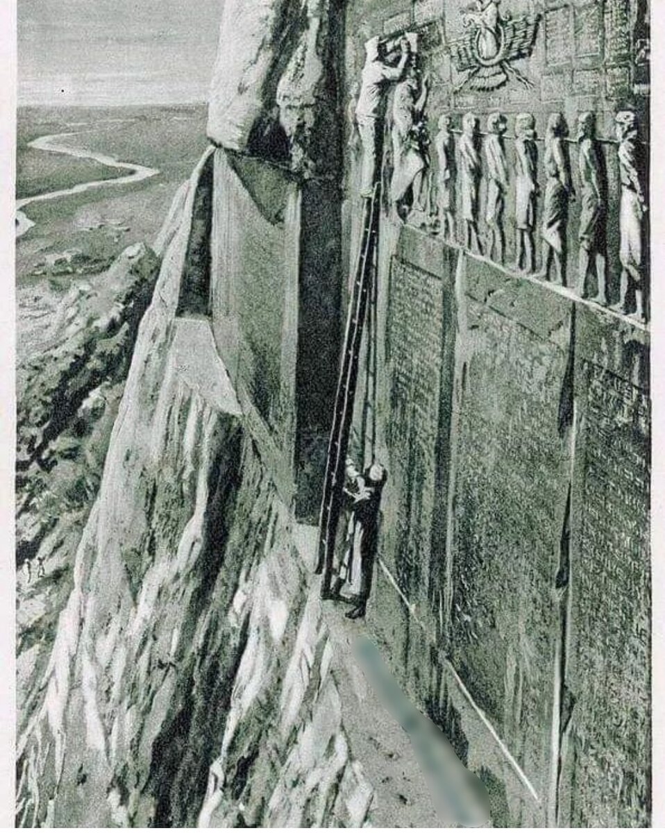 Именно так в 19 веке занимались экстримальное археологией в Ираке. Расшифровка древних текстов на древних артефактах в то время была уделом смелых и бесстрашных археологов, ибо работать приходилось в весьма экстримальное условиях. В общем как всегда наука требует жертв. На гравюре изображён сэр Генри Роулинсон( язык сломаешь пока фамилию выговорить) который стоя на краю обрыва, да ещё на лестнице со страховкой в виде бедуина переводит Бехустунскую надпись на барельефе высеченной на поверхности скалы. Построен этот памятник по поведению Дария Великого. Перевод мая надпись была написана на трёх языках, древнеперсидском, вавилонском и еламитском. Данный исторический артефакт представляет собой "место Бога". А теперь представьте как более древнии резчики по камню создавали этот комплекс. Согласитесь, весьма экстримальное было это занятие. На такой высоте, да ещё и без страховки в лучшем случае можно и личинку отложить....