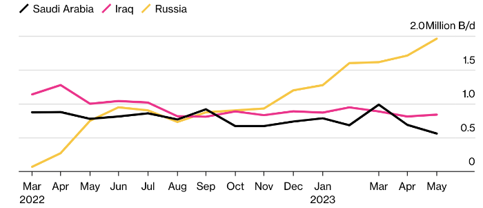 Импорт дешевой российской нефти в Индию в мае установил очередной рекорд. Страна, входящая в ОПЕК+ при отвоевывает долю рынка у Саудовской Аравии Объемы поставок нефти в Индию. Источник: Bloomberg По данным компании Vortexa Ltd., в прошлом месяце южноазиатская страна получала из России в среднем по 1,96 млн баррелей в день, что на 15% больше предыдущего максимума, установленного в апреле. При этом поставки из Саудовской Аравии упали до самого низкого уровня с февраля 2021 года. Согласно данным Министерства торговли и промышленности, средняя стоимость российской нефти с учетом расходов на фрахт, прибывшей на индийские берега в апреле, составила $68.21 за баррель. Это самая низкая цена с тех пор, как страна начала закупать большие объемы у Москвы. Средняя стоимость нефти из Саудовской Аравии, отправленной в Индию в апреле, составила $86.96 за баррель, а иракская нефть стоила $77.77 за баррель. Данные по цене за май, как ожидается, будут опубликованы в следующем месяце, но цены, скорее вс