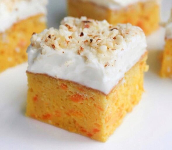 📝Ингредиенты: ⏺️Творог 2% - 180 г ⏺️Морковь - 100 г ⏺️Тыква - 75 г ⏺️Яйцо - 1 шт ⏺️Манная крупа - 40 г ( можно заменить мукой) ⏺️Молоко - 40 г ⏺️Сахзам - 4-6 г ( можно 100 г кокосового сахара или аллюлозы) , я делаю без сахара и готовую запеканку поливаю сиропом или медом. ⏺️Разрыхлитель - 1/2 ч.л ⏺️Цедра апельсина или лимона , корица Крем: ⏺️Творожный сыр - 50 г( легкий) ⏺️Мягкий творог - 50 г( 0%) ⏺️Сахзам - 1- 2 г ⏺️Орехи - 15 г (измельчить) ✅КБЖУ на 100 г 140 ккал 11.4/ 5.4/ 11.3 Приготовление: 1️⃣Морковь и тыкву в блендер ( хорошо бы тыкву сначала запечь, но я обычно пропускаю этот шаг ) 2️⃣Взбиваем в течение 2-3 минут яйцо с сахаром/сахзамом. 3️⃣Манную крупу залить молоком. 4️⃣Добавляем к яичной смеси творог, манную крупу, морковь, тыкву, цедру, пряности и разрыхлитель. 5️⃣Тщательно перемешиваем. 6️⃣Выкладываем смесь в форму. 7️⃣Выпекаем 35 минут (время зависит от толщины слоя теста) при температуре 180°. 8️⃣ Смешиваем творожный сыр, творог и сахзам. 9️⃣Смазывае