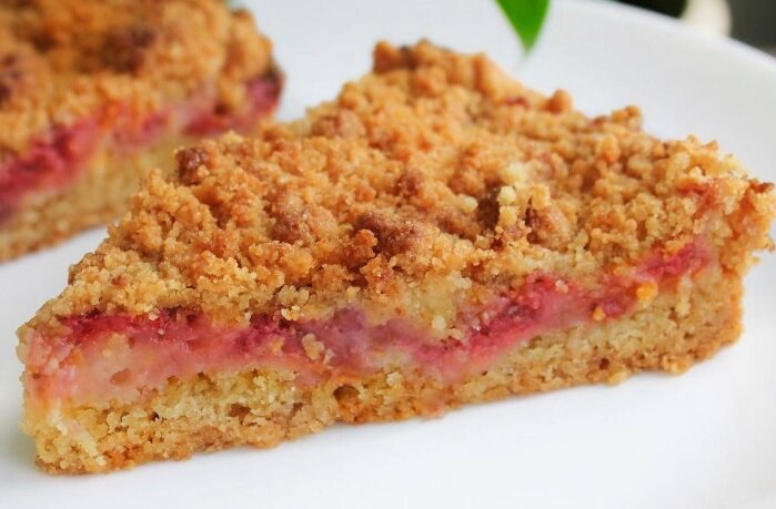5) Начинку выкладываем на тесто, сверху присыпать отложенной крошкой. 6) Выпекать 45 минут при температуре 180°