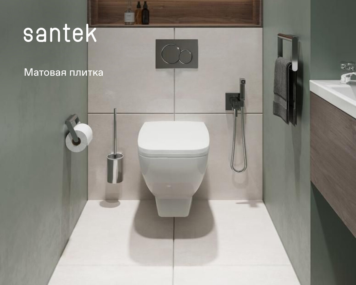 Матовая плитка в интерьере – это редкость. И зря. Рассказываем о ее преимуществах. 💧Эстетика и уют. Матовая плитка сделает интерьер неповторимым и элегантным. А благодаря приятной текстуре она превратит ванную в уютное место отдыха. 💧Антискользящие свойства. Матовая плитка – идеальное решение для полов в ванной комнате, так как она не скользит. 💧Меньше следов и пятен. На матовой плитке практически не видно следов воды, пятен и отпечатков пальцев. Вы сможете убираться намного реже. Лучше всего к матовой плитке подойдет классическая сантехника. Ее можно найти на сайте Santek.