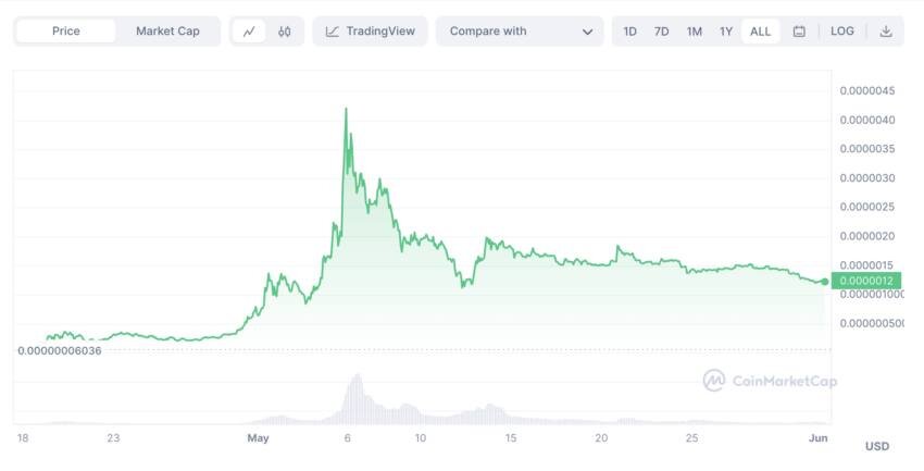 Криптовалюта, основанная на меме про лягушонка Пепе, ворвалась в криптовалютное пространство в мае 2023 года Она сразу наделала много шума, став первым популярным криптомемом, не связанным с собаками породы Сиба Ину. За несколько дней монета подорожала на сотни процентов и тут же стала любимицей охотников за быстрыми деньгами. Сразу несколько крупных площадок добавили мемный токен в листинг. Даже биржа криптовалют Binance включила ее в список доступных инструментов. На волне хайпа токен вошел в топ-100 криптовалют по рыночной капитализации и сделал долларовыми миллионерами как минимум 50 человек. Благодаря PEPE, около 50 адресов, преодолели отметку в $1 млн. Криптовалюта-мем достигла исторического максимума 5 мая на уровне $0,00000431. С тех пор она устойчиво дешевеет. На момент публикации один токен PEPE можно купить за $0,0000012. За минувшие сутки монета подешевела почти на 5%. По сравнению с ATH токен обесценился на 71%.