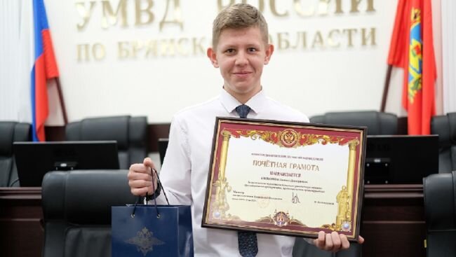 Брянский подросток Даниил Колжиков сегодня, 1 июня, получил почетную грамоту от министра МВД России Владимира Колокольцева. Мальчик в свои 14 лет помог полиции задержать напавшего на девушку разбойника. Напомним, такой поступок школьник совершил в прошлом году летом. Он стал свидетелем преступления в Володарском районе Брянска - вооруженный ножом мужчина напал на девушку. Он отобрал деньги у девушки и скрылся, а мальчик быстро добежал до ближайшего экипажа ДПС и рассказал им о произошедшем. Разбойника удалось сразу же задержать по горячим следам. Начальник брянской полиции Владислав Толкунов передал подростку грамоту от министра. Подротска наградили «за проявленное мужество и активную гражданскую позицию при задержании преступников, предотвращении правонарушений».