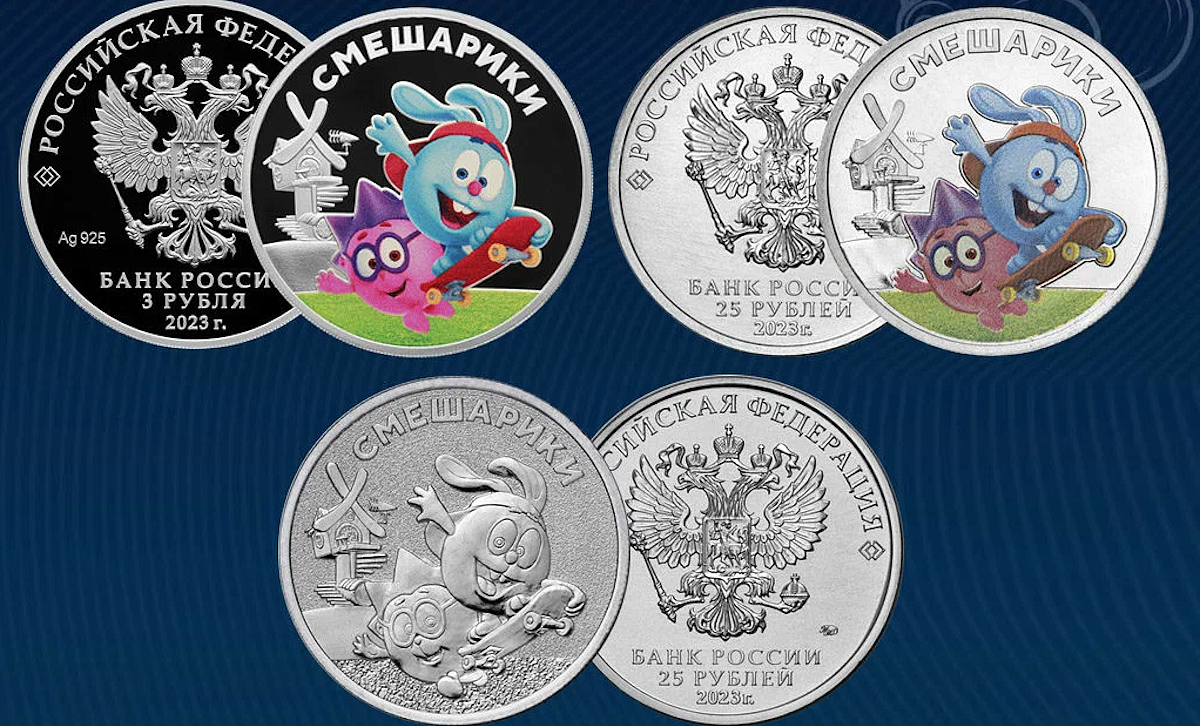 На деньгах России появились смешарики Центральный банк России сегодня выпускает в обращение памятные монеты, посвящённые мультсериалу «Смешарики», из драгоценного и недрагоценного металлов. По информации пресс-службы Банка России, выпущены монеты из серебра с цветным покрытием номиналом 3 рубля и монеты из недрагоценных металлов номиналом 25 рублей с цветным и обычным покрытием. На оборотной стороне монет расположено изображение героев мультфильма «Смешарики» на фоне рельефного домика Кроша. Вверху по окружности имеется рельефная надпись: «Смешарики». Серебряная монета выполнена из серебра 925 пробы, её тираж - 7 тысяч единиц. Монеты из недрагоценных металлов номиналом 25 рублей сделаны из стали с никелевым покрытием - 850 тысяч единиц. Тираж монеты из медно-никелевого сплава с цветным покрытием - 150 тысяч единиц. Центральный банк напоминает, что эта монета является законным средством наличного платежа на территории России и обязательна к приёму без ограничений. Ещё больше новостей на