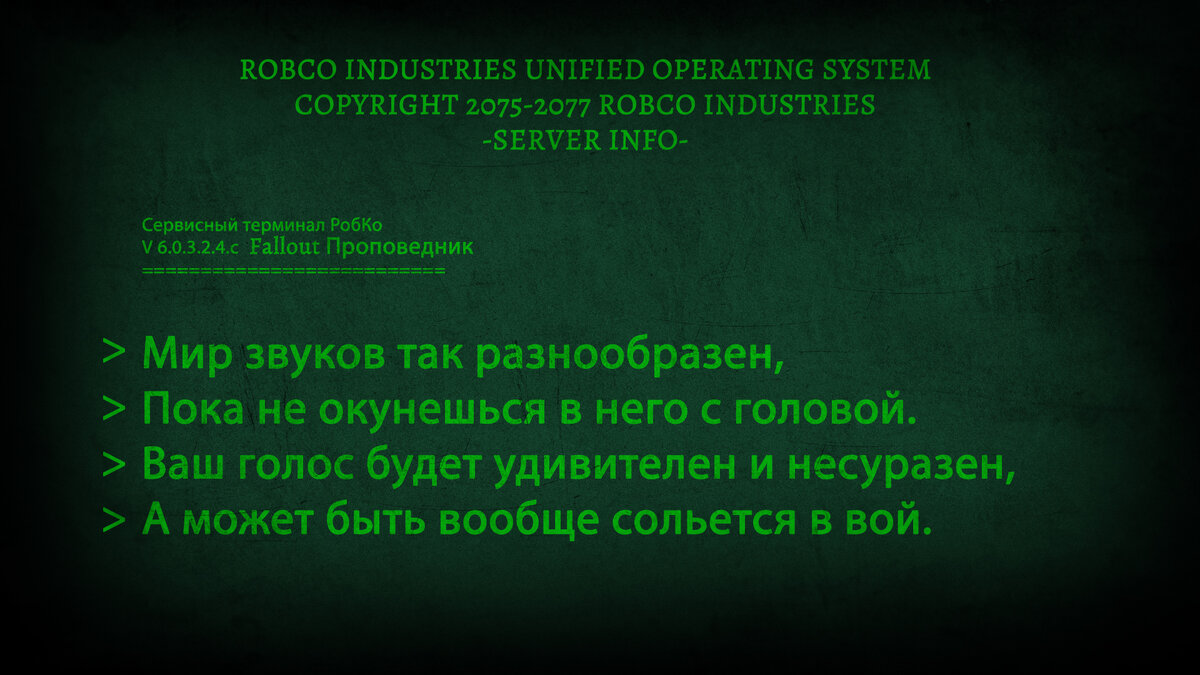 И снова всем привет. Это очередной выпуск Fallout Проповедника и сегодня не будет никаких историй. Ага, именно так вы не ослышались. Дело не в том, что мне не хватило фантазии на новое продолжение истории, просто мне захотелось с вами поговорить. Разумеется, какой-то важной темы я тоже не заготовил. Так что если вам интересны только лишь мои истории, то погодите до следующего выпуска все обязательно будет. А я тем временем расскажу вам, что творится в моей жизни ушлого путника среди пустошей. Несмотря на то, что я нахожусь вместе с вами в мире Fallout, тем не менее мне так же требуется где-то жить. Я конечно понимаю, что вам хотелось бы, чтобы я жил в своей студии. Но я все же живой человек, а не робот zxtu_i_vc2. Кстати вы бы знали каких чудес дикции приходится добиваться, говоря в микрофон? Одно лишь выговаривание имени этого ИИ стоит не малых усилий. А перестраивать свой голос под особенности нескольких персонажей – сильно напрягает голосовые связки. Самое сложное кстати, это не мон
