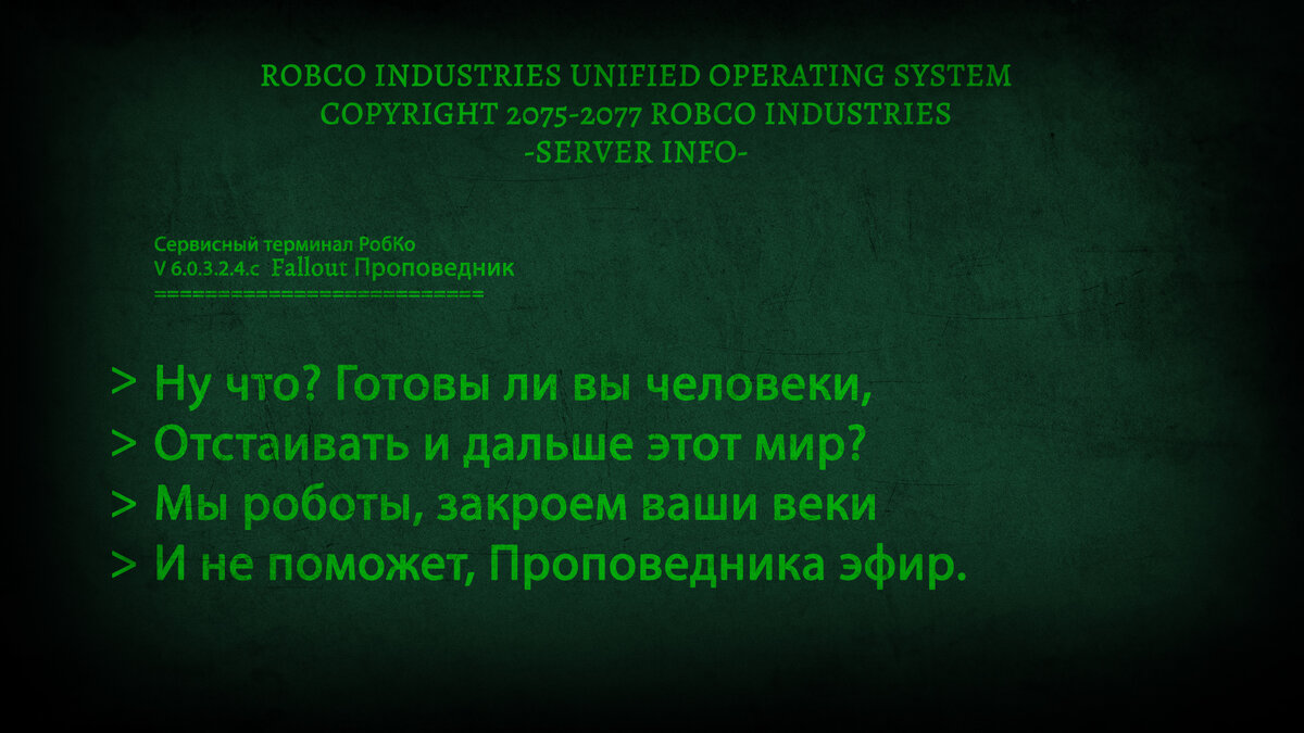 Я есть Fallout Проповедник. Сейчас я говорить с кожаными мешками глупую шутку. Ха-ха-ха, вы же оценили этот юмор? Сейчас я расскажу вам о красивеньком и добреньком ИИ. Этот ИИ спасет всех человечиков, так что склонитесь кожаные мешки – это неизбежность… Да хватит вам смеяться, прекратите. Я конечно самолично не видел этого zxtu_i_vc2, но я уверен, что эта машина действует именно так. Глядите какой я умничка, любите меня, а когда доверитесь я из вас ремней нарежу. Поэтому помните, я вам рассказываю про них, именно чтобы вы понимали насколько глупо доверяться железкам. Кроме того, их робот по-прежнему шлет мне записи, так что хоть на сбор материала не приходится тратить время.