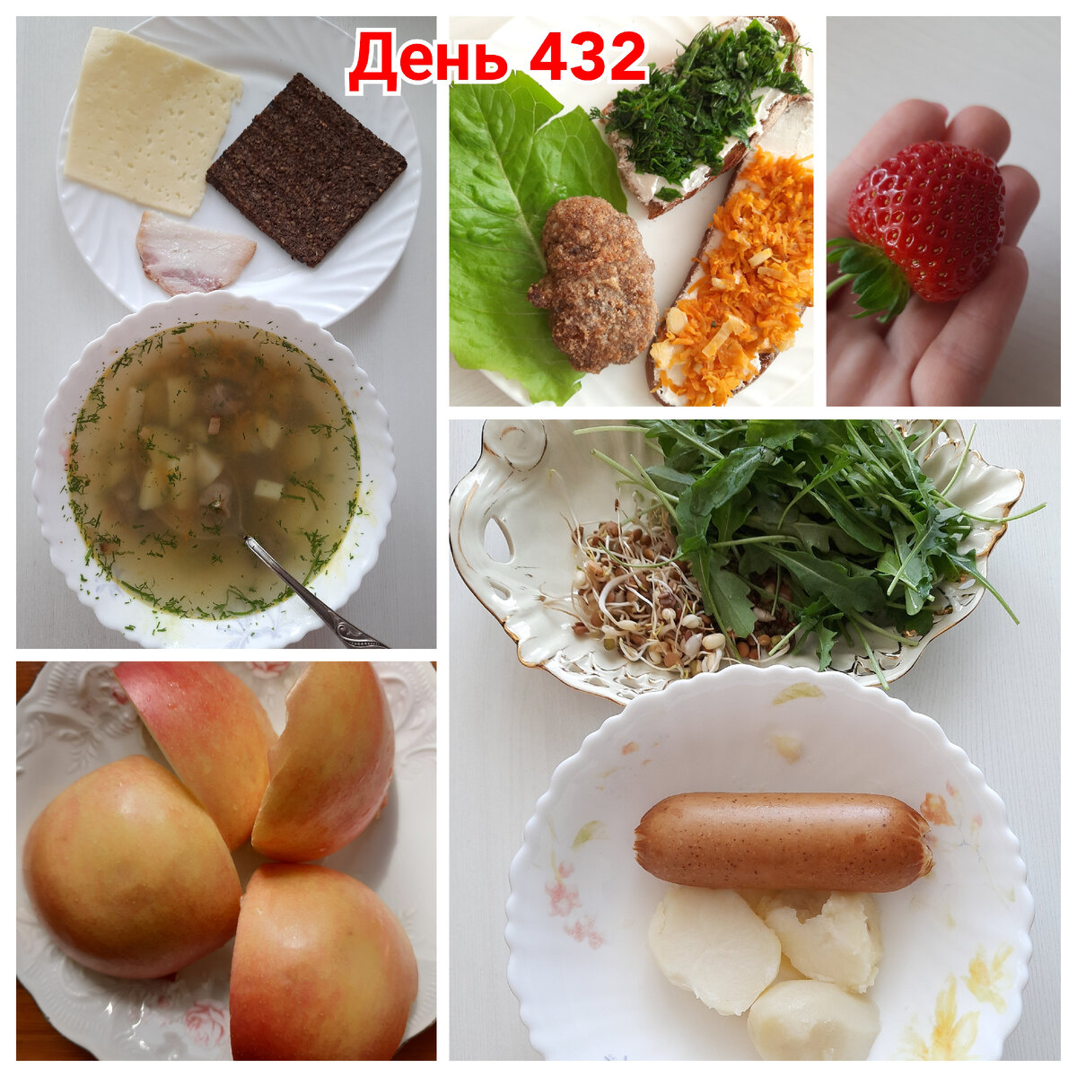 #Завтрак – кофе с фермерским молоком за кадром. Лист салата. Дарницкий хлеб на гриле. Тост с творожным сыром и зеленью. Второй тост с творожным сыром и зажаркой из моркови и лука. Домашняя котлета в панировке из сухарей с отрубями. #Обед – отварной картофель, сарделька с горчицей из Вкусвилл (из закупки 9). Руккола и проростки зелени и семян – из той же закупки 9. #Десерт – яблоко. И одна огромная клубничина с моего поддонника. Красная, сочная, но еще все равно кисловатая! #Ужин – суп с куриными сердечками. У сердечек отрезаю часть с жиром, снимаю пленки, если есть. В кастрюле с большим количеством воды отвариваю сердечки, минут через 5 после закипания добавляю 1 большую картошку, порезанную кубиками. Добавляю зажарку из лука и моркови на топленом масле. Солю по вкусу. В самом конце посыпаю замороженным укропом. У меня еще осталась одна баночка, нужно использовать, а то уже свежий укроп на огороде пошел! К супу у меня спортхлеб из Вкусвилл (та же закупка 9), кусок копченого сала от фер