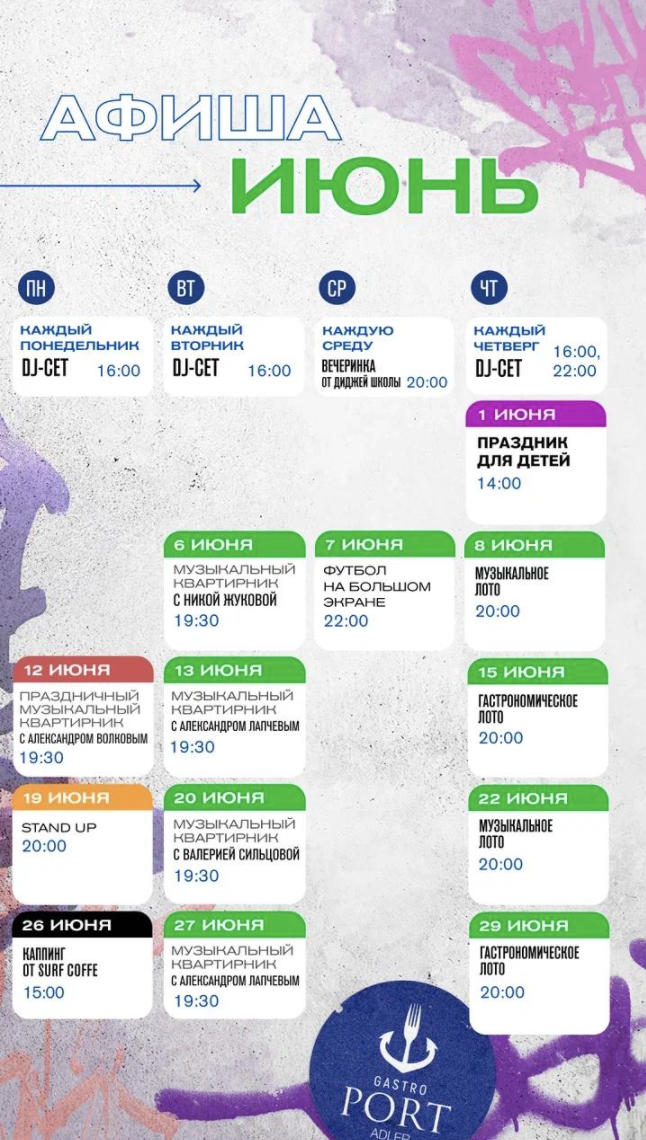 Июнь — насыщенный на мероприятия месяц, поэтому помимо чек-листа, который мы подготовили для вас на днях — у нас тут еще афиша от GastroPort Adler 🤍 Активности у ребят каждый день, поэтому сохраняйте и выбирайте идеи на каникулы. С первым днем лета вас, друзья!