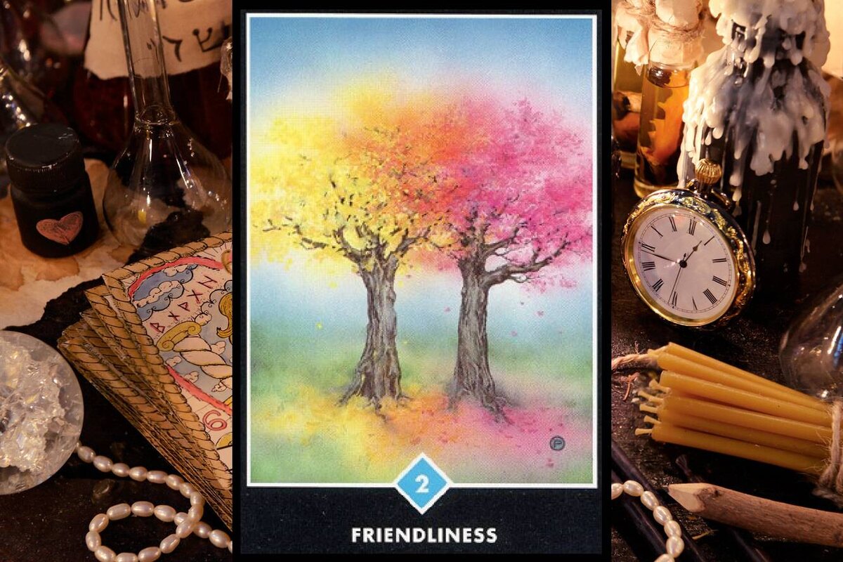 Дружелюбие. Ветви этих двух цветущих деревьев переплетены, их упавшие лепестки смешаны на земле в своих прекрасных оттенках. Это как будто земля и небеса, соединенные любовью. Но они стоят сами по себе, каждый посажен в землю и находится в своем собственном соединении с землей. Так они представляют собой суть того, что происходит между вами, легкие в отношениях друг с другом, естественные. В их соединении нет назойливости, нет требования, нет желания изменить другого. Это рождение любви, которая действительно безусловна, без ожиданий и требований.