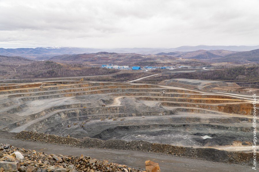 Сначала мы приехали на смотровую одного из карьеров. Всего их тут четыре, два из которых уже отрабатываются, а два других введут в эксплуатацию позже. Запасов Быстринского месторождения хватит примерно на 40 лет.